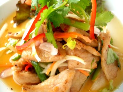 豚トロはスライスしてから下味をつけます。オーダーが入ったらソテーしてからドレッシングと野菜とあえます。ドレッシングはライム汁、ナムプラー、砂糖、唐辛子。肉類なのでチリソースを入れるシェフもいますが、さっぱり感と豚トロの味わいやすさでバンダルでは入れません。でもご希望の方は遠慮せずに言ってくださいね。