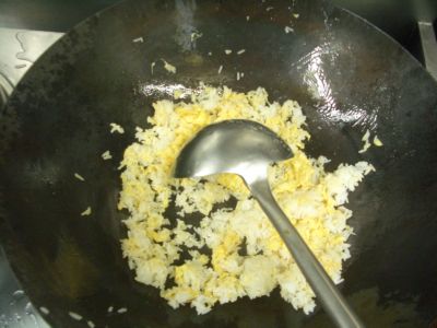 材料は入れる順に近くにおいておくとスムーズに炒めれます。とにかくスピードです。あまり遅くかき混ぜているとお米が油を吸いまくりますし、また米のでんぷんが出てきてしまい引っ付きやすくなるためほぐしにくくなります。(それを防ぐためにも卵を入れたら直ぐに米を入れてかき混ぜて米の表面に卵のコーティングを作るんです)