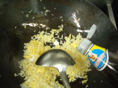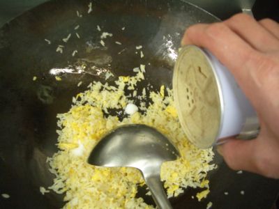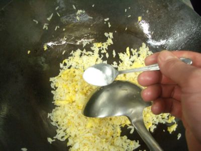 砂糖を入れます。砂糖の量を多くすれば甘いチャーハンになってしまいますので注意です。砂糖は甘みを出すためではなくコク出しのためですので入れすぎに注意です。