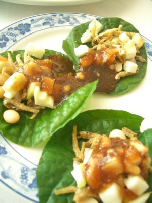 チャプルーという葉っぱにピーナッツ、干しえび、ココナッツファイン、生姜、レモンなどに甘酸っぱいタマリンドをベースに作るタレをかけて食べる伝統のオードブルは日本ではあまり見られないと思います。