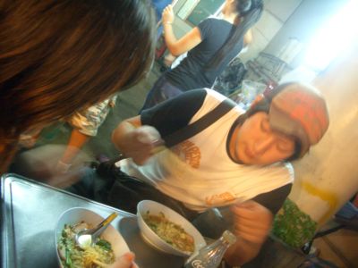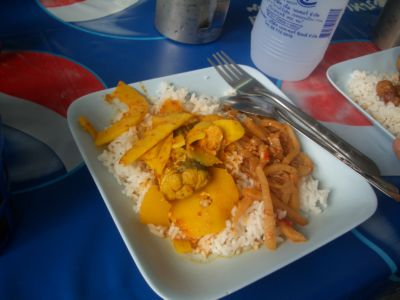 パタヤに向かう前に少し朝食。ターミナル入り口にあるおかずをご飯に載せてくれるお店で食べました。おかず1種類だと30バーツ(約84円)、2種類選ぶと40バーツ(112円)。20種類以上のおかずから2チョイス。酸っぱいカレーと辛み炒めを食べてからバスに乗り込んでパタヤへ。