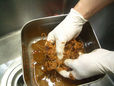 水かぬるま湯につけておきます。時間がないときは熱湯を