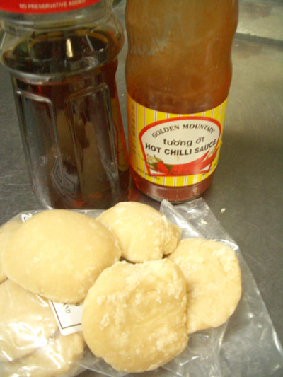 奥左手にナムプラー、のチリソース、パームシュガー。