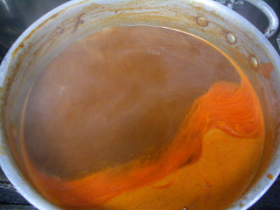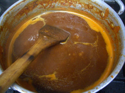 チリソースを入れます。仕上がりの色がきれいになります。ちなみにアメリカではトマトケチャップを入れていました。