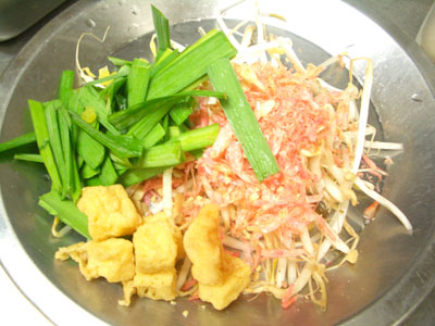 具は、中麺ビーフン(セン レック)、卵、エシャロット、エビ、モヤシ、ニラ、桜エビ、砕いたピーナッツ、揚げた豆腐、タイのたくあん。