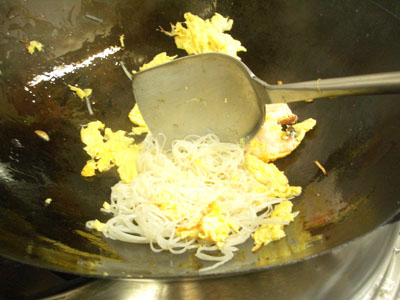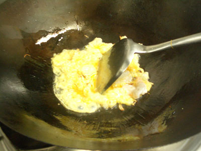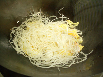 香りが出たら卵を入れます。卵を入れる前にビーフンを入れて炒めて、しんなりしたら卵を入れる人もいます。
