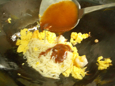 しんなりしてきたら昨日作ったパッタイのソースを入れます。しんなりしてきたビーフンは成分のお米のでんぷんに火が入っている訳なので、すこし引っ付いてきます。あまり慌てずに。