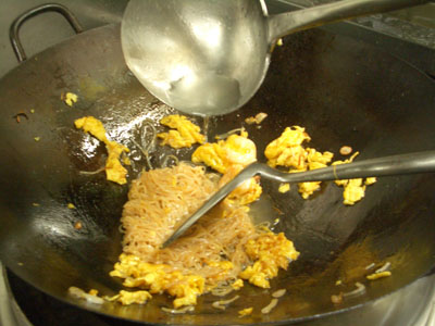スープ、又は水を加えてビーフンに火を通します。水分を足さないと玉になってきますので、適度な水分を加えて炒めます。