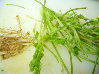 パクチーの茎と根っこ。泥がついているときもあるので洗います。