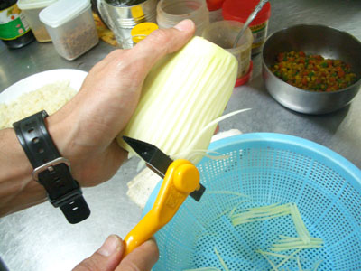 青パパイヤは皮を剥いたら専用のピーラーで細く長く切り出していきます。