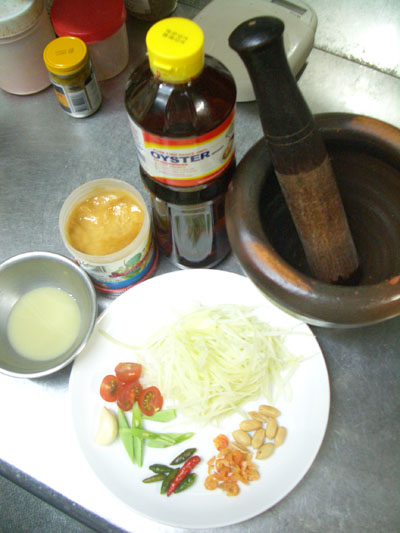 ナムプラー、パームシュガー(椰子砂糖)、ライム汁、青パパイヤ、プチトマト、インゲン、唐辛子、干しえび、ピーナッツ
