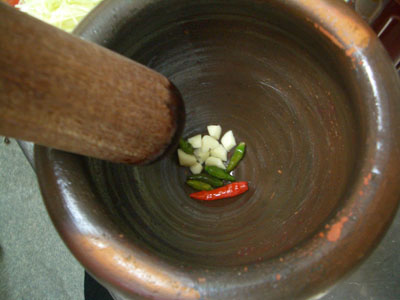 ニンニク、唐辛子をクロックに入れてつぶします。