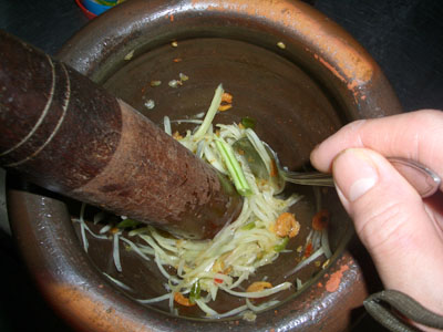 青パパイヤ、干しエビ、ピーナッツ、インゲン、プチトマトを入れて木槌でたたいていきます。