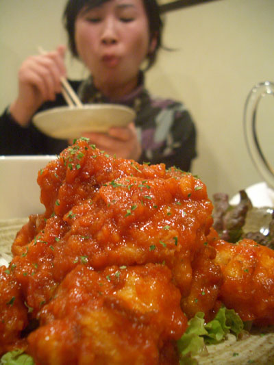 エビチリのアップ 会話もそこそこに食べる