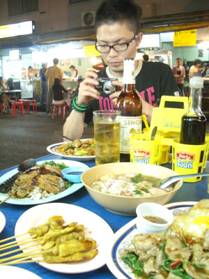こんな感じにならんでいて、チキンライス屋の前にあるテーブルに座っても豚足煮込みを別途頼んでも問題ない。屋台がいっぱいあればあちこちに注文して持ってきてもらえる。お勘定は誰かがまとめてやってくれる。