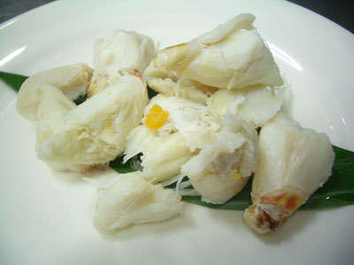 カニを1度蒸してから身を取り出しています。ぼろぼろで小さな身がほぐされているのではなく、大きなかたまりの身もゴロゴロしています。少量ですがカニの卵がついているものも。
