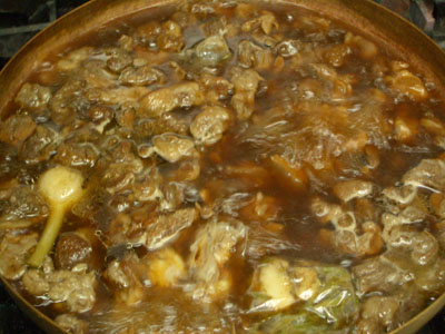 その後に調味料を合せて煮込んでいく。約1時間弱の間、アクが出てきたら取り除いてあげる。調味料は3種の醤油、砂糖、塩。香料として、八角、シナモン、ニンニク、酢漬けにんにく、ショウガ、パクチーの根、など。