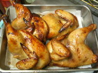 日本にある多くのタイ料理店でガイヤーンを出す際は骨なしのモモ肉か、骨付きモモを使っているところが多いみたいです。バンダルも当初は骨付きモモを使っていました。しかし今年は丸ひな鶏をしようして、タイ本土同様に丸鶏を焼いています。