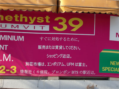 家の近くに張ってあった大きな看板、新築コンドミニアムの告知ですが、面白い表記の日本語が普通に掲げてあったので一枚。ふふ。翻訳ソフトそのままでしょうね。こんな表記バンコクの至る所で見れるので面白いですよ。