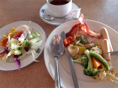 豪華なホテルの朝食を期待する人は寂しい種類と思うかもしれませんが、自分は十分な感じです。このほかにもおかゆやコーンフレークとかもありましたし、フルーツもありましたね。