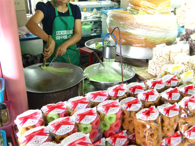 このお菓子を買ったらおまけで出来たてのを2個サービスしてくれました。そのお姉さんのエプロンはなぜか韓国語。ふふ。