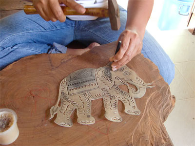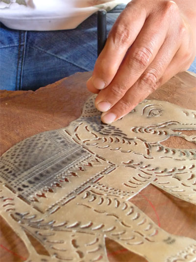 牛、水牛の皮から作るのですが、作る人形の特徴に合わせて薄め、中ぐらい、厚めの厚さに皮を使い分けます。まず紙に人形の型をかいてくり抜き、ペンキスプレーで吹き付けて下地をつくります。それをノミで切り取っていきます。