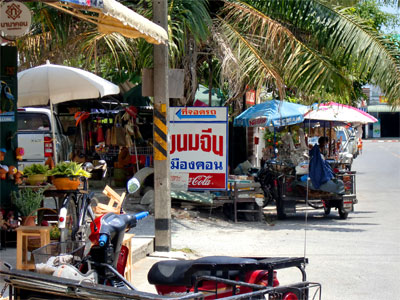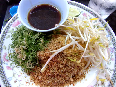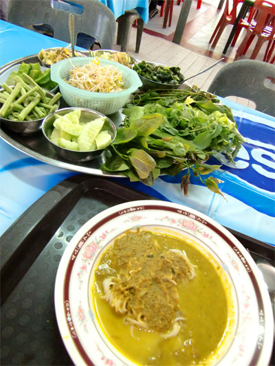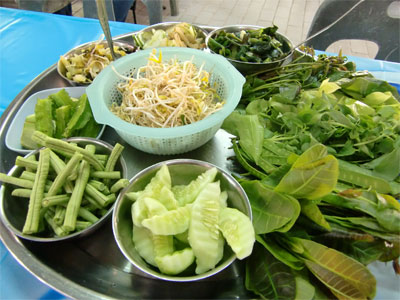 これに南部独特のウコンの利いたカレーをかけてもらいました。レモングラスやタイショウガの香りがとてもいいカレーですが、やはり辛いです。ちょうどスプーンとフォークを手にしたときに運ばれてきたのが野菜盛り合わせセット。しかもこの店のは朝の店より大きい上に種類も豊富なものを持ってきてくれました。これ全部タダ。さすが南タイ。