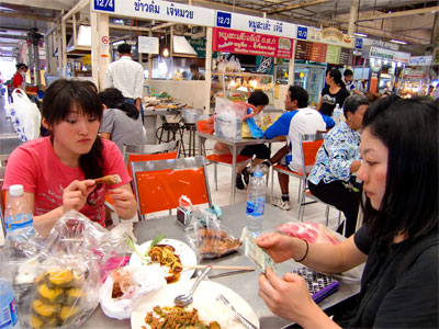 ちょうどお昼時で、場内にある屋台群でランチ。JJマーケットよりこちらの方が広く快適に食事ができます。種類も豊富です。空いてるテーブルに買ったものを広げてのんびりランチ。これがタイでの最後のランチになりますから、いっぱい食べました。