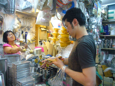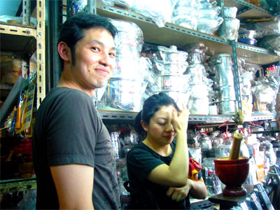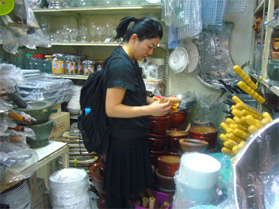 園原さんは青パパイヤサラダなどで使う木製の臼を探し中。自分のお土産。