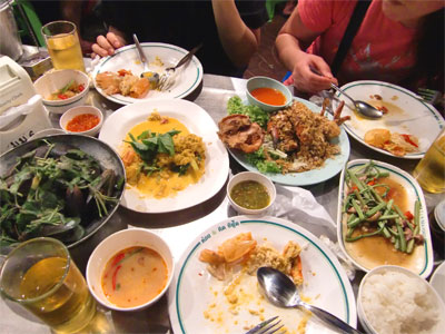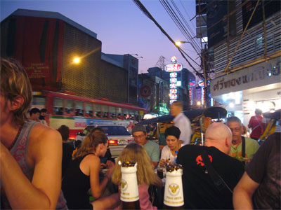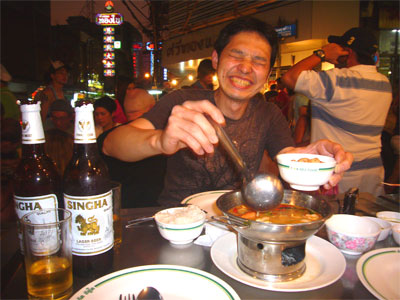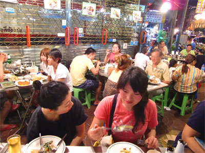 あー、タイを感じながらの食事ー、ってな感じで満喫なところをパシッと。おいしかったです。近くを通る車の排気ガスと騒音、スタッフの大きな呼び込みや無駄話などが交差しながら料理を突っつくのも楽しいです。