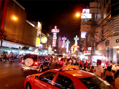 香港とかみたいでしょ?バンコクですよ。昼も夜も人と車の多い活気にあふれた地区です。