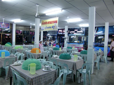 バンコクを同時刻で出発したバスで行き先が同じ方角で同じ国道をたどるバスはここでまた落ち合います。1等冷房車も含め、全席指定のバスは途中で乗り換えとかは出来ません。