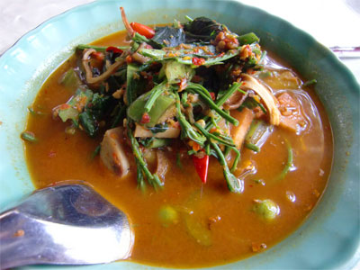 間もなくすると、これもおすすめの北部定番カレー「ゲーン ケー」。実は初めて食べるカレーです。鶏肉にしましたが、カエルもチョイスできます。カレーペースト自体はレッドカレーに近いのですがもっとシンプルなペースト。でもその配合とたくさん入った野菜の味で良し悪しが決まりそうな感じがしました。最初、苦手な野菜が入っていたので唾を飲み込んでしまいましたが、ぜんぜん食べられました。野菜の豊かな香りが充満するカレーはとーっても美味しかったです。