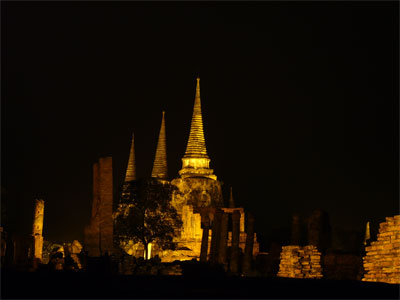 夕方にはアユタヤ遺跡を見学に。夜はライトアップされます。中には入れませんが、夜見る遺跡はまた幻想的に見えます。灯篭流しの行事には花火やイベントも行われます。