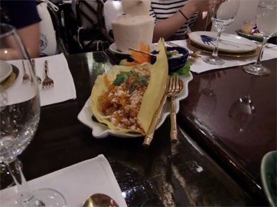 ザボンを使ったサラダ(左写真)はあいちゃんの希望で注文。タイでもどこでも目にするものでもない前菜、「カノム ブァン ユアン」。ベトナムのバインセオとほとんど同じです。これを作るのも大変。
