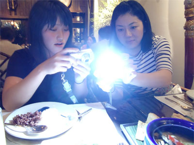 料理が出てくるたびに写真撮り。光っているのはフラッシュをたいた決定的瞬間です。