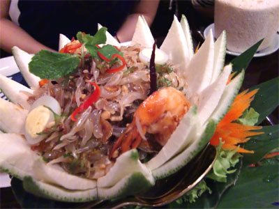 お勧めを尋ねると「ヤム サムンプライ」とのこと。訳すると「ハーブサラダ」になりますが、癖のない味。しょうがや青マンゴー、ピーナッツ、揚げたエシャロット、チャプルーと言う葉っぱの千切りなど。量が多かったー。