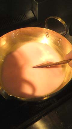 まず粉を水で溶かしてから火にかけます。写真の中身が赤いのは赤のシロップを加えて赤くしてあるからです。ゆっくり火を通していくと透明になってきます。