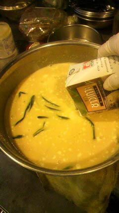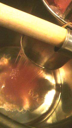 次に穴のあいた容器に流し入れ、ぎゅーっと押し出していくと(ちょうどところてんのような)細い線が流れ落ちていきます。下には冷たい水がはってあり、流れ出たのが直ぐに冷えるようになっています。熱いうちに流さないと冷えたら流れなくなってしまうのですばやく行います。