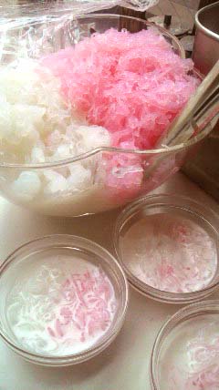 水をよくきって容器に盛り付けて完成です。これに甘く煮たココナッツミルクを冷やしたのを入れて食べます。タイではクラッシュアイスを入れてもくれます。今日は2色でしたがバイトーイ(パンダナスリーフ)で緑を加えるともっとカラフルできれいになります。
