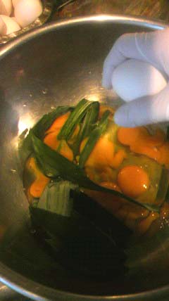 玉子をバイトーイ(パンダナスリーフ)と一緒に混ぜて香りを移したら、