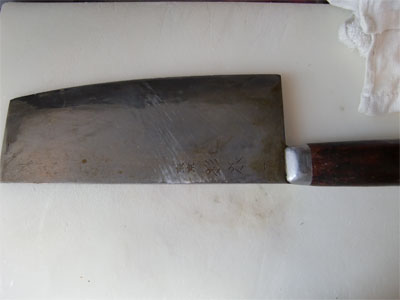 実はこの包丁は2代目で、初代は日本橋にある木屋の中華包丁を使っていました。本店まで買いに行って選んできたお気に入りでしたが、職場で誰かがスペアリブ(骨付き肉)を切ろうと使い、刃が欠けただけでなくゆがんでしまい使えなくなってしまいました。まぁ、大きい包丁だしいけるだろうと思ったんでしょうね。骨切り用は別にあったんですけど。
