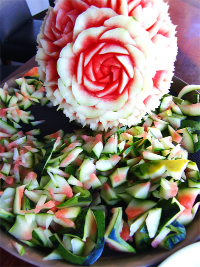 なにはともあれ、お誕生日に添えるスイカのカービング、あとで他の果物も添えてフルーツ盛り合わせのサービスです。お誕生日おめでとうです。