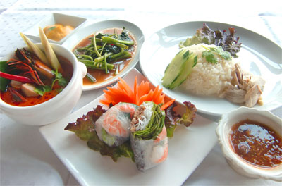 概要としては、一押しのチキンライス、カオマンガイに人気の小前菜、タイ料理の代表的なスープ、鉄分豊富な野菜炒め、デザートまでつけたセットです。