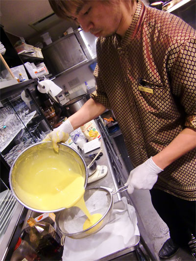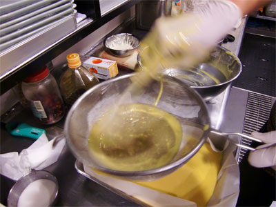 へらで濾してあげて完成です。寝かせてから蒸しあげます。