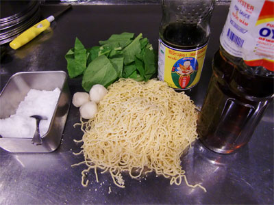 卵麺、小松菜(ざく切り)、薄口しょうゆ、ナムプラー、砂糖、コショウ。トッピングには焼きチャ-シュウ、魚団子やワンタンやかまぼこなどお好きなものをチョイスしてください。