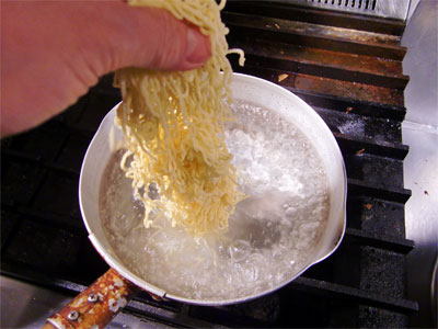 沸騰したお湯に麺を入れます。必ず沸騰したお湯でないと麺のこしがなくなり、でろでろふにゅりになります。