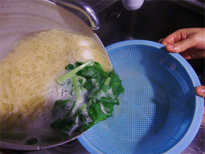 麺が仕上がるちょい前に小松菜を入れます。この小松菜は別に茹でておいても大丈夫です。
