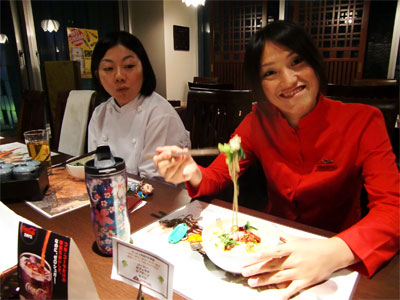 あとは笑顔で食べればおいしくなります。今日は遅くまで頑張ってくれたあいちゃん(右 赤)と園原さん(左 白)の夜食に作ってあげました。お疲れね。