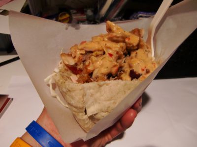 店頭には鶏肉を何層にも積み重ねたおいしそうな色のケバブ。注文と同時に肉をそぎ落とし、トマトやキャベツなどと挟んで特製ソースをかける。